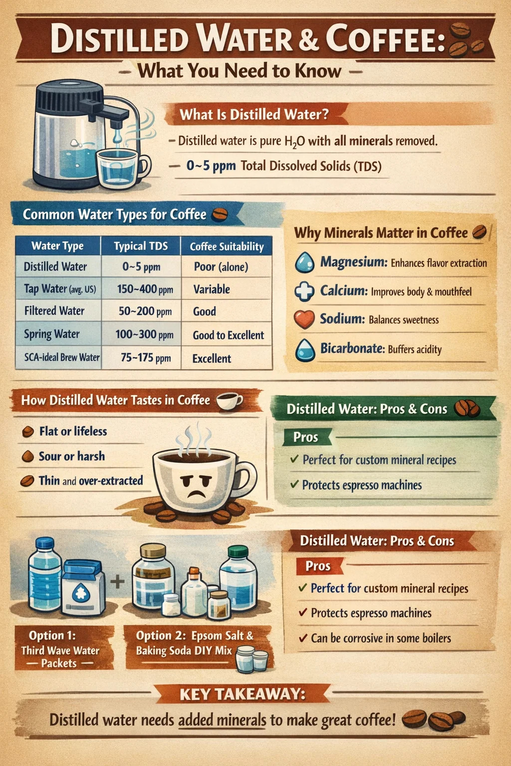 توضح هذه المقالة بالضبط ما يحدث عند استخدام الماء المقطر لتحضير القهوة، وما يقوله العلم، وكيف يؤثر تقطير الماء، وما هي البدائل التي تمنحك نتائج أفضل دون التخمين.