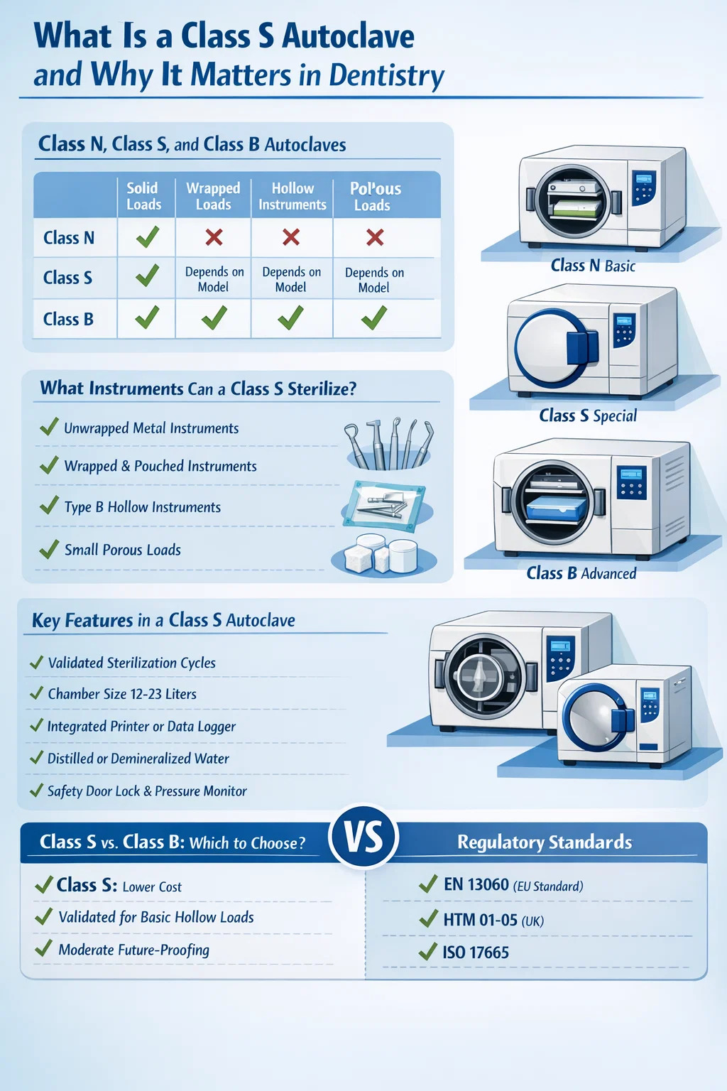 الأوتوكلاف من الفئة S عبارة عن معقم بالبخار مصمم للتعامل مع نطاق محدد من الأحمال المحددة من قبل الشركة المصنعة - ويقع بين الفئة N الأساسية والفئة B ذات القدرة الكاملة من حيث أداء التعقيم. في ممارسة طب الأسنان، يعد جهاز الأوتوكلاف من الفئة S أحد أكثر وحدات التعقيم استخدامًا لأنه يوفر توازنًا عمليًا بين التكلفة وسرعة الدورة والقدرة على معالجة الأدوات المجوفة والمسامية القياسية في أي عيادة أسنان.
