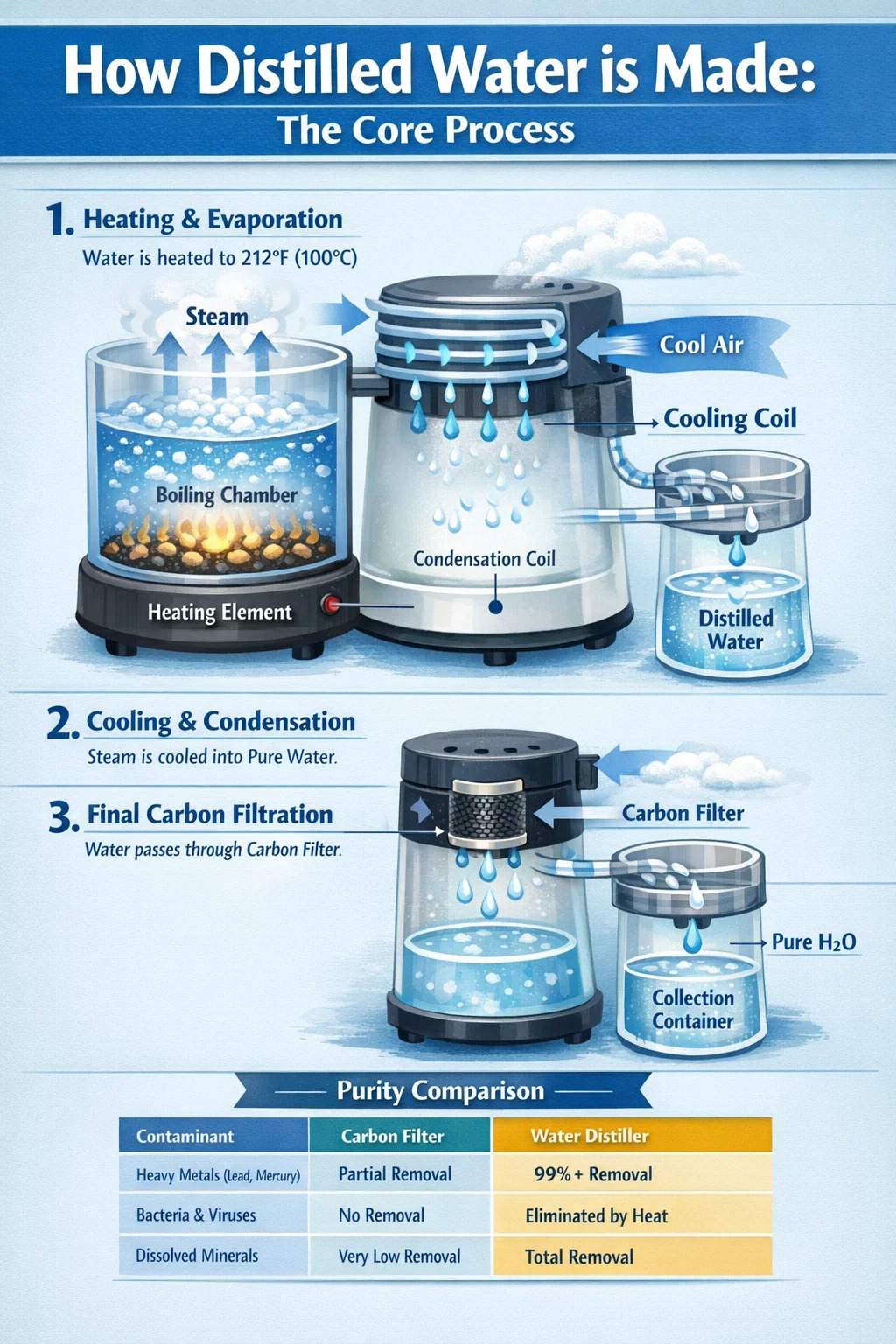 تبدأ العملية عند غرفة الغليان تقطير المياه مملوء بماء الصنبور. يقوم عنصر التسخين الكهربائي الموجود في القاعدة برفع درجة الحرارة إلى 212 درجة فهرنهايت (100 درجة مئوية) . عندما يصل الماء إلى درجة الغليان، فإنه يتحول إلى بخار. قد يتم إطلاق الغازات المتطايرة من خلال فتحة التهوية، بينما تظل الملوثات غير المتطايرة مثل الرصاص والزرنيخ والفلورايد محاصرة في خزان الغليان.