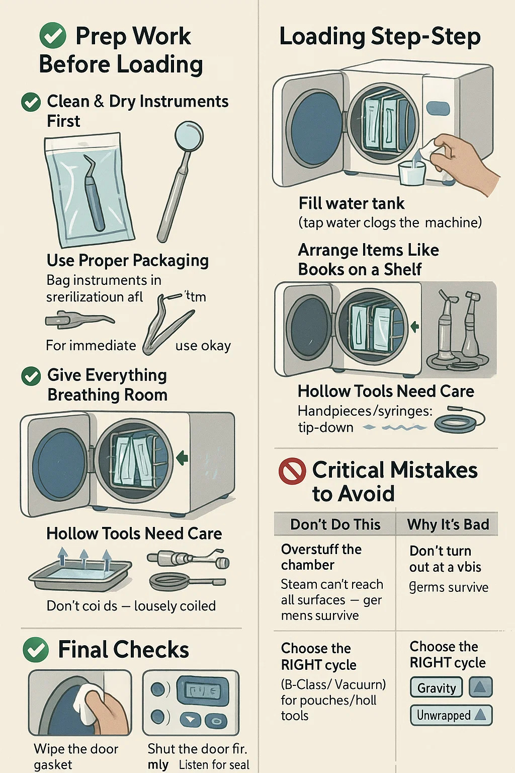 الأدوات المجوفة تحتاج إلى رعاية ← المقابض/الحقن: ضع الطرف لأسفل حتى يدخل البخار إلى الأجزاء المجوفة. ← لا تجمع الأسلاك – بل ضعها بشكل ملفوف بشكل غير محكم.
