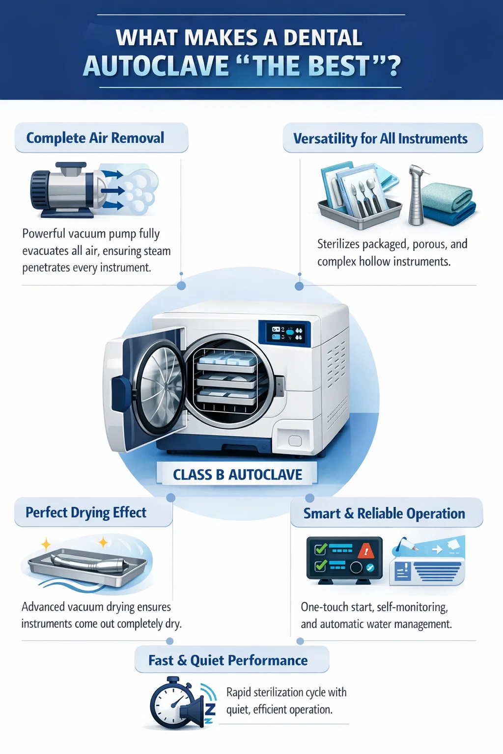سبب أهمية ذلك: تحتوي قبضات وأدوات طب الأسنان على العديد من القنوات الداخلية الصغيرة. إذا لم تتم إزالة الهواء بالكامل، فلن يتمكن البخار من اختراقه، ولن يكون التعقيم كاملاً.
